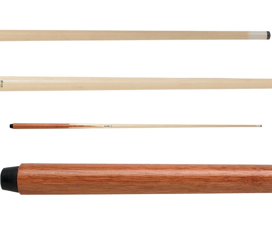 The Action One Piece 57-inch house pool cue is made with Russian maple. This cue utilizes a fiber ferrule, a 13mm tip and pro taper and is available in 18-21 ounce weight options.