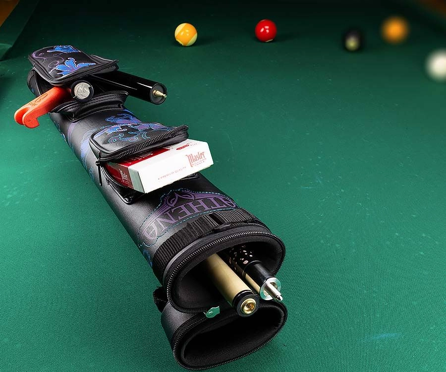 If butterflies are your favorite then you will love this 2 butt and 2 shaft hard case. ย This vinyl case is black with bright purple and blue butterflies featuring the new Athena owl logo. This case includes an upper handle and an adjustable shoulder strap.