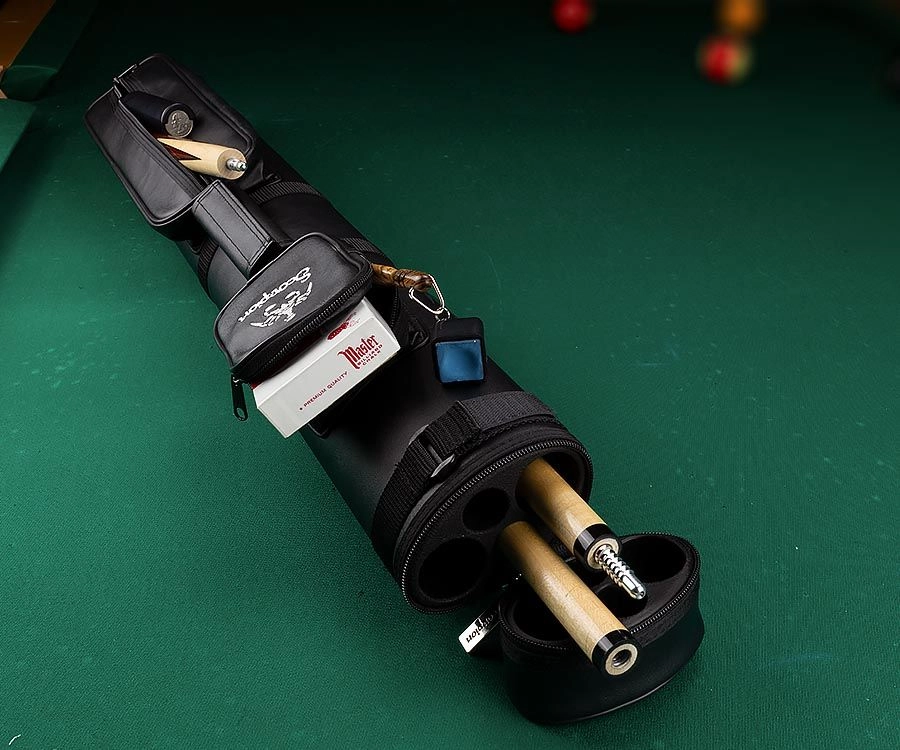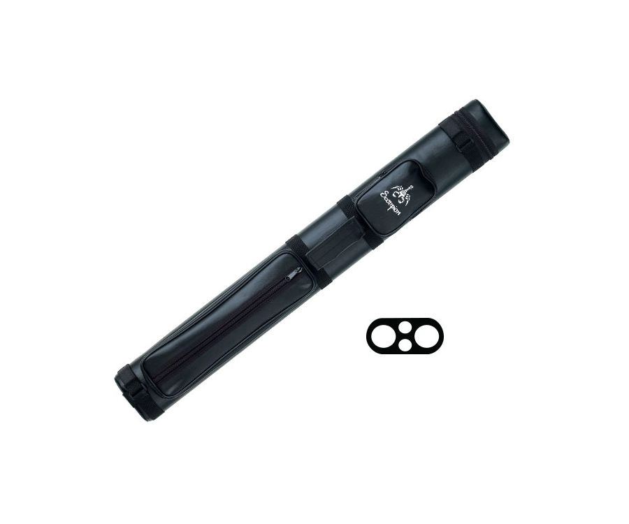 This Scorpion pool cue case is built to fit 2 butts and 2 shafts. The interior structure is a casing molded from poured rubber and lined with soft felt cloth to ensure a comfortable ride for your cues. The outside of this case is a black vinyl oval with black plastic feet to help keep it lasting long. There are also two large pockets so you can carry all of your pool accessories with you. The smaller of these pockets is adorned with the Scorpion logo to confirm to you that you are getting a Scorpion quality case.
