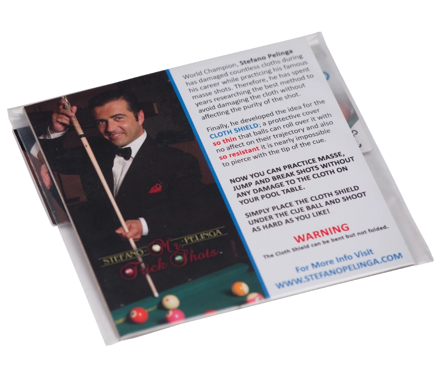 Eager to try out that new tricky jump shot but terrified that you might burn a spot on your table? Fear not! Endorsed by Stefano Pelinga, these nifty little things are called Cloth Shields and they’re made to protect your table felt from skids, spots, and burn marks caused by those more extreme shots.